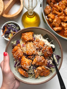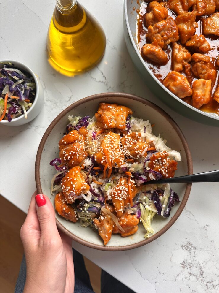 This meal has become one of those “everyone cheers when it’s on the menu” kind of dinners in our house. It’s packed with flavor, has a great balance of protein, carbs, and veggies, and honestly just feels fun to eat. The chicken gets that crispy texture on the outside, while staying juicy on the inside. The sauce is seriously addictive (and yes, I double it sometimes just to drizzle on top of other things all week).