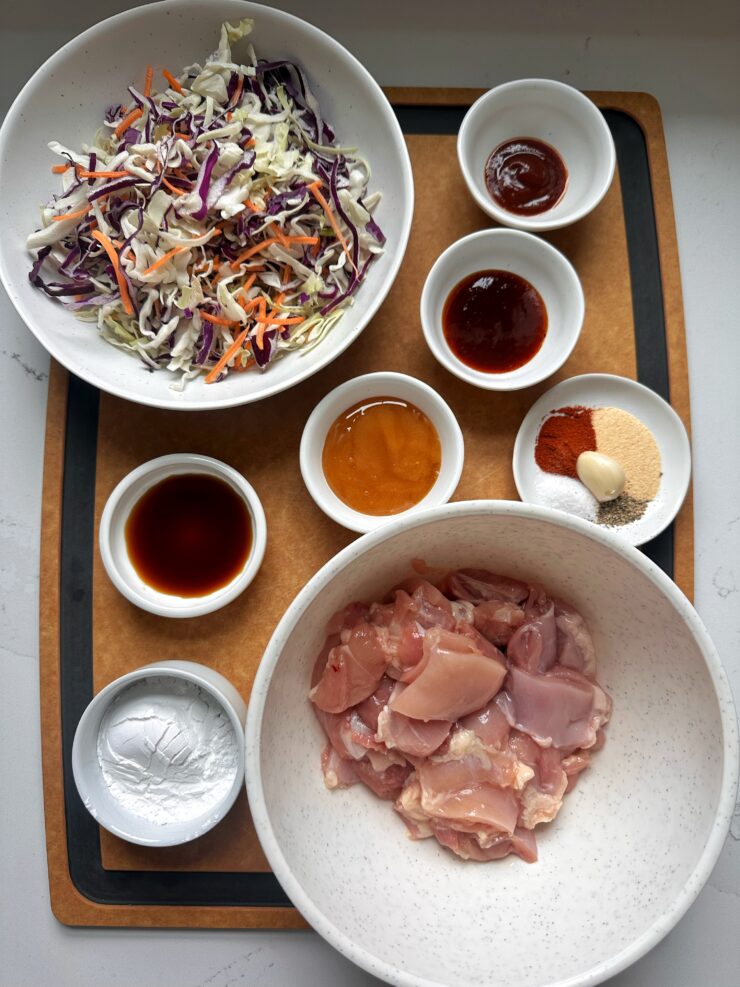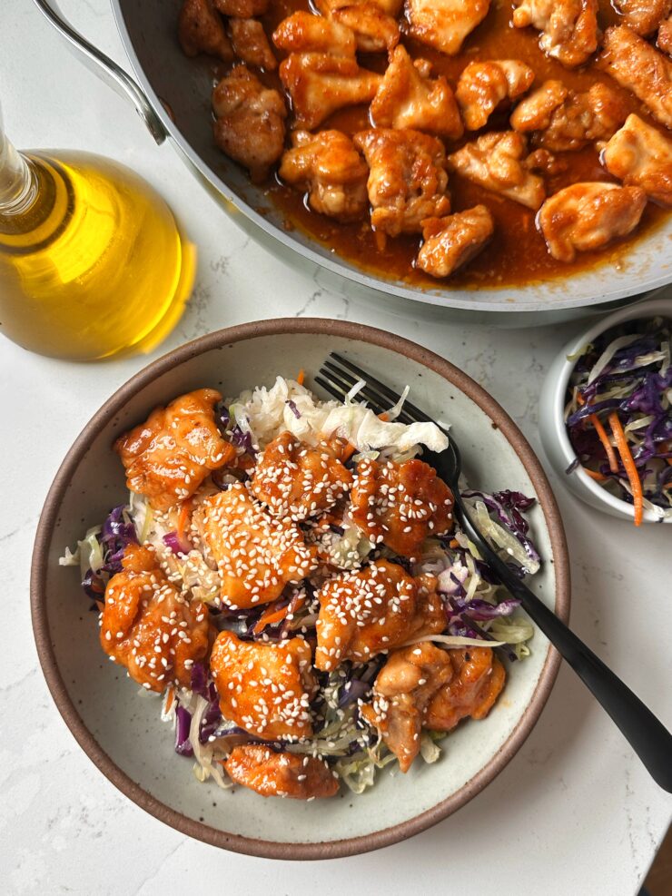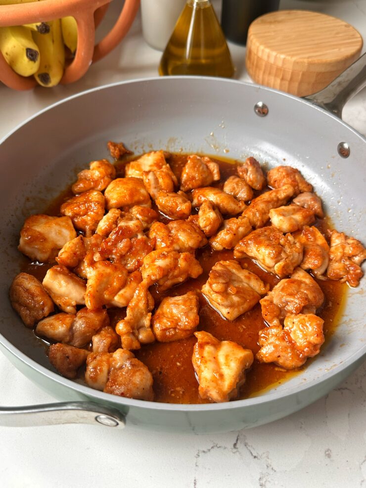 - Tapioca Flour or Cornstarch – This is used to coat the chicken and helps form a light, crispy crust when pan-fried. It mimics that deep-fried texture without the heavy grease and adds a little crispness to hold onto the sauce.