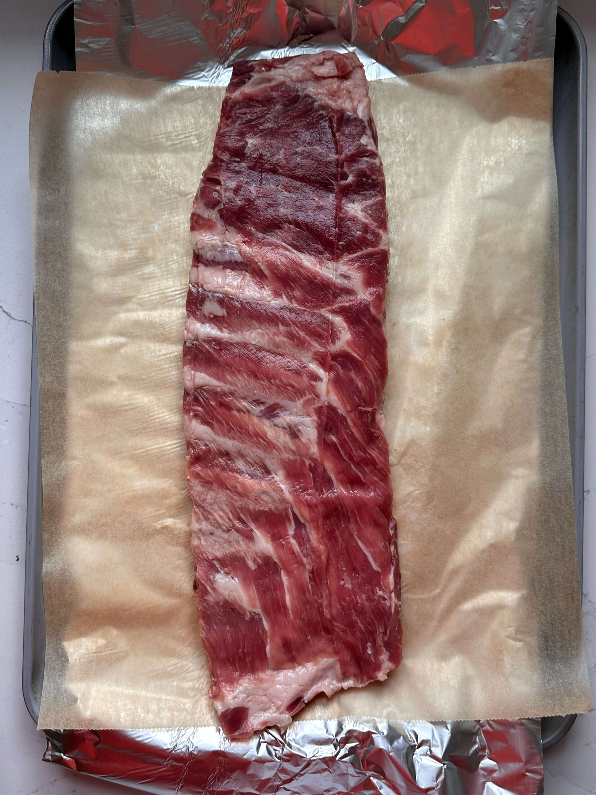 - Create a Cooking Packet: Tear off a sheet of aluminum foil slightly longer than the rack of ribs. Place a sheet of parchment paper of similar size directly on top of the foil. Lay the rack of ribs, bone side down, on top of the parchment.